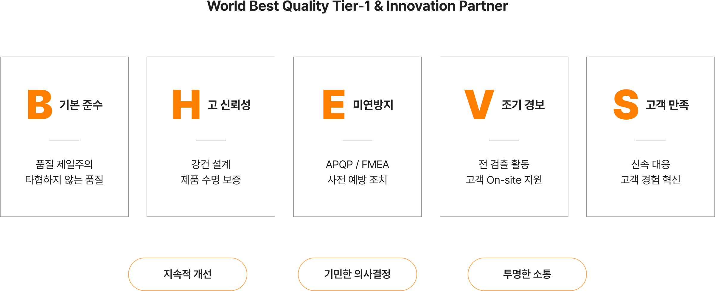 BH EVS는 자동차 APQP 프로세스를 기반으로 개발품질을 보증하고 Error Proofing 공정 Set Up을 통한 불량 유출방지 체계를 확보하여 안정적으로 고객품질 목표를 달성하고 있음