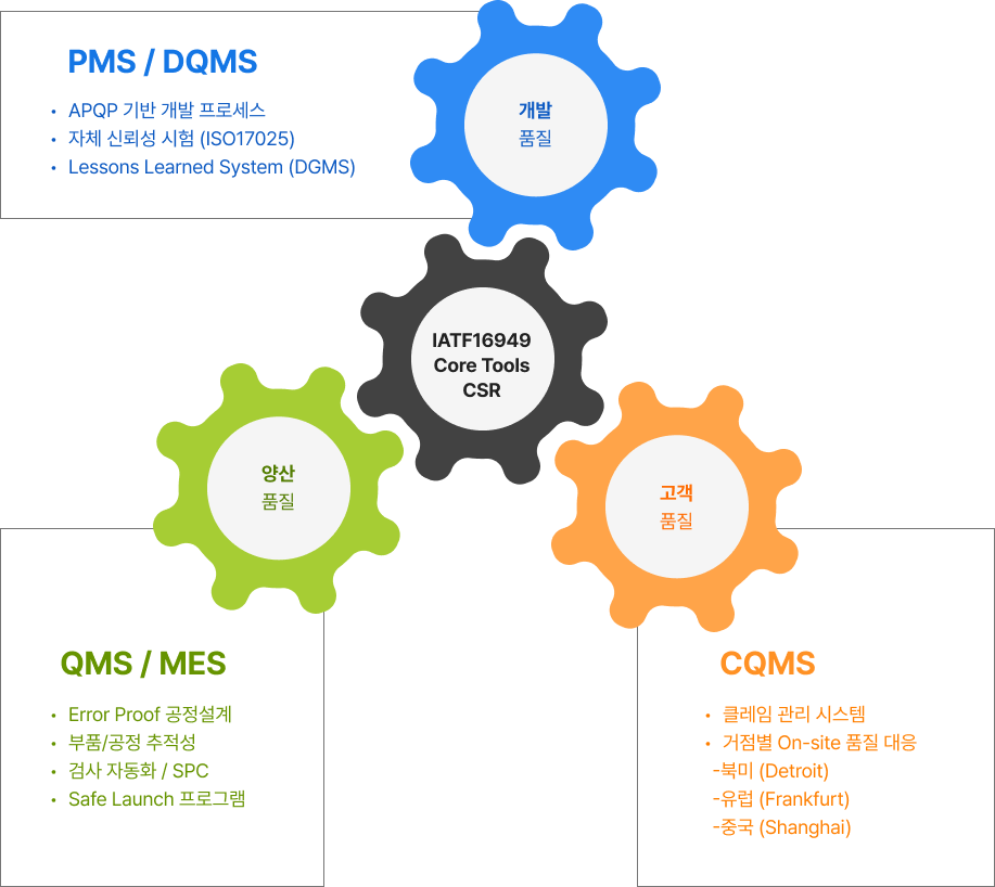 BH EVS는 자동차 APQP 프로세스를 기반으로 개발품질을 보증하고 Error Proofing 공정 Set Up을 통한 불량 유출방지 체계를 확보하여 안정적으로 고객품질 목표를 달성하고 있음