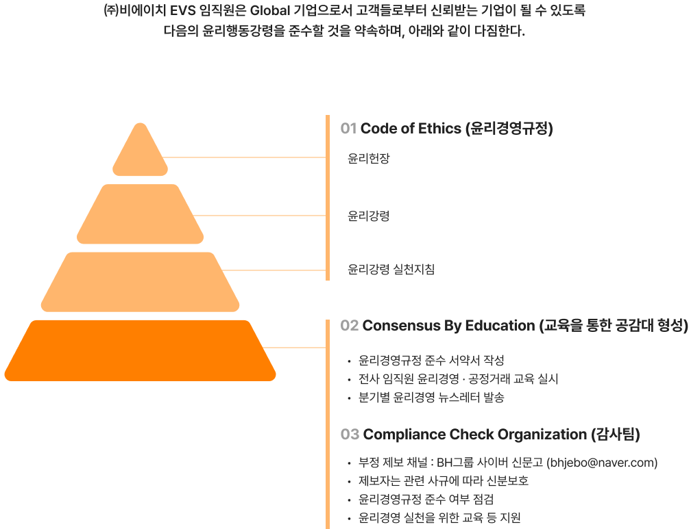 앞으로 우리 ㈜비에이치 EVS는 글로벌 최고 수준의 윤리경영 실천을 향해 계속 매진해 나갈 것입니다. 윤리경영을 선도하며 ‘Global leading No.1 Company’로 성장 ∙ 발전하는 ㈜비에이치 EVS에 끊임없는 관심과 성원 부탁드립니다.